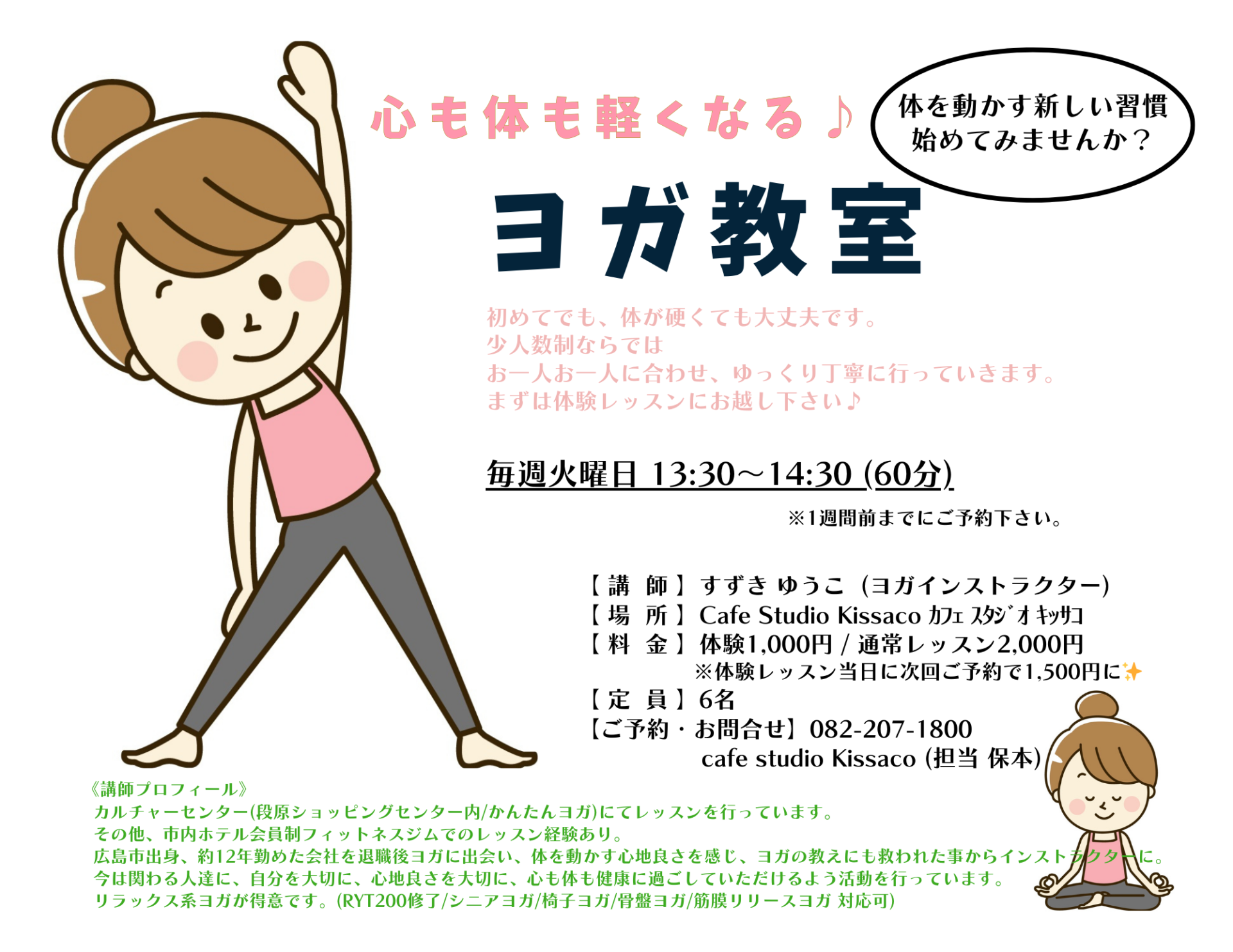 Cafe Studio Kissacoカルチャー教室にヨガ教室が加わりました! 2025 3/01 information 2023年9月12日2025年3月1日 Cafe Studio Kissacoカルチャー教室にヨガ教室が加わりました! 講師:すずきゆうこ(ヨガインストラクター) information エアコンクリーニングを実施しました!! キッサコでAutumn mini Concertが開催されました!!